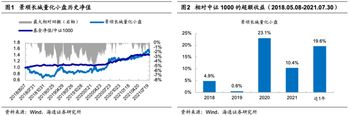 自产品成立以来(剔除前3个月建仓期),截至2021年7月底,产品累计收益53.9%,年化收益14.1%,相对于中证1000指数的年化跟踪误差为5.8%,最大回撤7.1%。分年度来看,自2018年以来,产品每年均可跑赢中证1000指数;特别是2020年、2021年,相对中证1000的年超额均在20%以上。