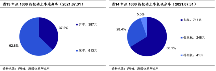 从上市地来看,中证1000指数成分股中387只为上交所上市股票,占指数权重的37.2%;613只为深交所上市股票,占指数权重62.8%。从上市板块来看,科创板和创业板成分股数量分别为41只和248只,权重合计占比超1/3;整体而言,中证1000指数更加侧重捕捉深市新兴产业及创新创业企业的成长性。