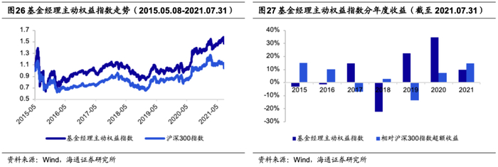 同样地,我们基于基金经理管理的产品构建基金经理主动权益指数,来刻画其业绩表现。虽然指数基日几近2015年牛市高点,初期产品建仓后经历大幅回撤(逾50%),但基日以来(截至2021.07.31)仍获得44.86%的累计收益,相对沪深300指数的年化超额收益为5.86%,业绩表现突出。分年度来看,在2015到2021年期间的多个年份,均战胜沪深300指数,体现出其在不同市场环境下较为稳定的投资管理能力。