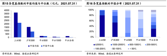 从市值方面来看,截至2021.07.31,指数成分股市值均值与中位数分别为117.5和84.9亿元,与沪深300和中证500等大中盘宽基指数差距明显;从市值分布来看,集中分布在50-100亿、100-200亿和200-500亿区间,小市值特征鲜明。