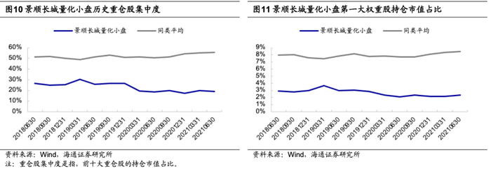 基于个股总市值,将全市场股票划分为3种类型,市值最高的10%的大盘股、市值分位点处于10%-30%的中盘股、以及市值最小的70%的小盘股。统计景顺长城量化小盘的持股市值分布(下图右),结果与上文对指数成分股分布的结论一致。产品在小盘股中的权重占比最高,其次为中盘股,在大盘中的占比很少。