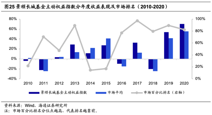 规模快速上升得益于优异的历史业绩。基于基金公司管理的主动权益产品(普通股票型和偏股混合型基金,下同),剔除3个月建仓期后,构建基金公司主动权益指数,来观察公司的整体业绩表现。2010年以来(截至2021.07.31),景顺长城基金主动权益指数获得10.65%的年化收益,年化波动率为22.93%;近5年表现更为出色,年化收益达20.18%,夏普比率1.03。