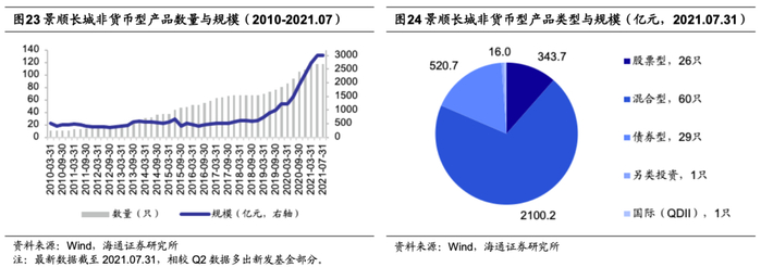 景顺长城基金旗下非货币型产品规模自2019年以来快速增长,截至2021年7月底,产品数量为118只,规模达2999.3亿元,较2019年底增长144.25%,市场排名14/145。从产品类型来看,以混合型基金为主,占比70.02%,并贡献了主要的规模增量;股票型基金和债券型基金占比分别为11.46%和17.36%。