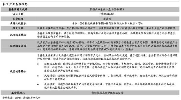 1. 景顺长城量化小盘成立于2018年2月6日,是景顺长城旗下的一只主动量化产品,也是目前市场上现存的、以中证1000指数为股票业绩基准的四只主动量化基金之一。