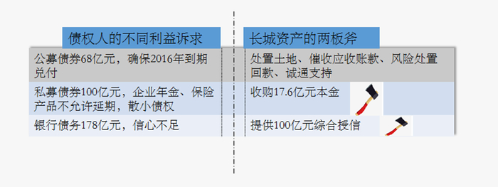 更麻烦的是第二道坎,100亿元的私募债券,这个时候,长城资产通过竞标,获得了中国铁物重组的财务顾问身份,开始协助中国铁物化解债务。长城资产开始设想银行债务和私募债券统一制定重组方案,整个方案的原则是:本金安全、部分还债、留债展期、利率优惠、转股选择权,前提是保障投资人本金不受损失,思路是现金偿付一部分、展期与利率优惠一部分、债转股一部分,股东支持一部分。方案看似比较完美,但执行起来也颇为不易,草案能不能通过,展期后的钱从哪来,都是未知数。