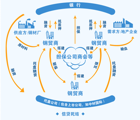 到底发生了什么?我们要说一下2008年之后盛极一时的钢贸业务,2008年全球经济危机之后,我国开启了4万亿投资计划,全国大兴基建,如火如荼,钢材贸易升温,钢材贸易是一个资金密集型业务,而且需要囤货,东南沿海地区钢贸商基本都是民营企业,典型的融资模式是来自于福建周宁商人的上海周宁模式,这个模式是5户联保+动产质押+担保机构担保,来向金融机构融资,杠杆很高,泡沫逐渐形成。后来,中国铁物这样的国企央企也参与了进来,他们这种模式被称为托盘业务,凭借着自己央企的信用背书,从银行、债券市场获得低成本资金,托盘的模式是先帮助钢贸商支付货款,相当于帮助钢贸商支付货款,钢材放在第三方仓库进行监管,货权暂归国企,一段时间后,钢贸商通过加付一定的利息偿还资金后,拿回钢材货权。实际上就是为中小钢贸上提供高息的过桥融资。说白了,公司扮演的,就是影子银行的角色。既不占有资源,也不占有客户,又没有银行的风控体系和能力。问题也就出在了这里,2010年国家房地产调控政策的出台,钢铁行业的产能过剩导致钢材价格急转直下,钢贸上资金链断裂,宁愿不要钢材也不会偿还托盘借款,再加上,大量钢贸上存在重复质押、空单质押、资金挪用到高利贷和房地产等地方,钢贸商本身面临着很大的财务压力,整个钢贸行业发生了非常严重的危机。自2011年起,长三角地区爆发钢贸企业集中大面积违约,据统计,截至2013年底,全国钢贸贷款敞口约为1.5万亿元,2011年上海地区最早泡沫破裂,广东、福建、山东等地也是钢贸重灾区。不仅是中小企业风险上升,大型企业集团风险也在暴露。真正主力在大型国有企业,信贷敞口大约在5000-1万亿。