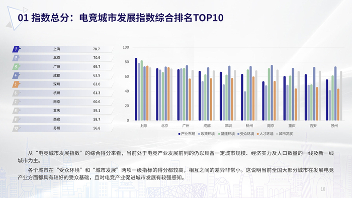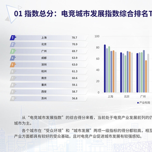 在“电竞城市发展指数”的综合得分排名中,上海以78.7分位居第一。