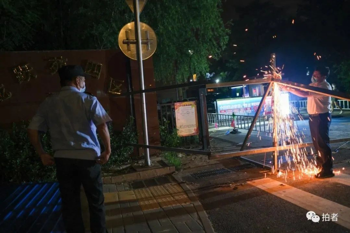8月11日23时许,良庄家园,居民隔着围挡拍摄大门外风景。