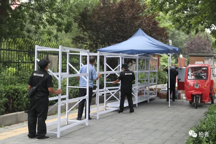 ▲8月12日10时许,龙跃苑四区外,安保搬来货架,用于摆放快递及外卖。