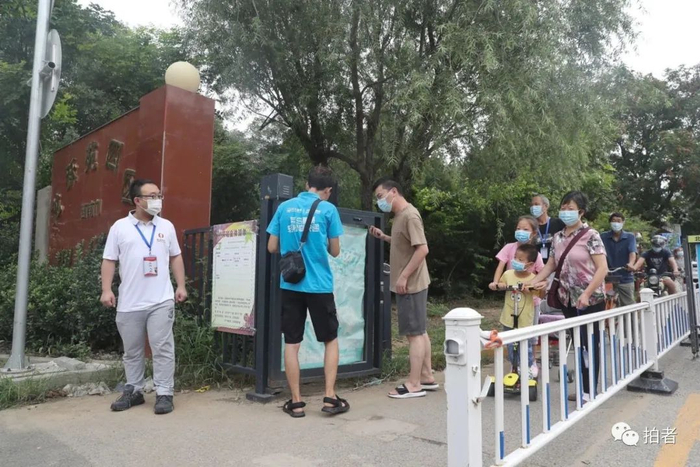 ▲8月12日9时许,志愿者在小区门口检查出入证与测量体温。根据规定,居民进入需展示出入证并测温。