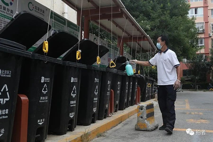▲8月12日10时许,工作人员对垃圾桶进行消杀。