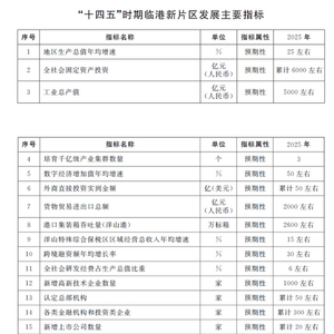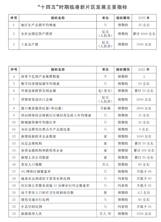 《规划》指出,到2025年,聚焦临港新片区产城融合区,建立比较成熟的投资贸易自由化便利化制度体系,打造一批更高开放度的功能型平台,集聚一批世界一流企业,区域创造力和竞争力显著增强,经济实力和经济总量大幅跃升,初步实现“五个重要”目标(集聚海内外人才开展国际创新协同的重要基地、统筹发展在岸业务和离岸业务的重要枢纽、企业走出去发展壮大的重要跳板、更好利用两个市场两种资源的重要通道、参与国际经济治理的重要试验田)。