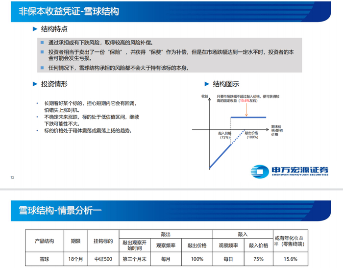 以申万宏源挂钩中证500的非保本型雪球产品为例,该标的挂钩中证500,敲入价格为75%,敲出价格为100%,期限为18个月,只要市场跌幅不超过敲入价格,年化收益为15.6%。