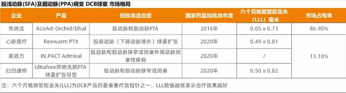 比同类产品提前三年上市,为先瑞达拉开市场渠道差距,产品创新迭代都留下了足够的时间窗口。虽然目前有多款同类产品上市,但从国内已获批外周DCB产品核心指标临床数据如LLL(六个月晚期管腔丢失)来看,先瑞达的产品仍然具有竞争优势。