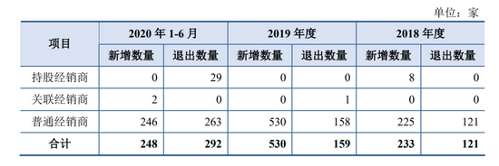 2018年和2019年持股经销商的变动情况还算稳定,基本没有退出,但在2020年上半年持股经销商突然减少近3成,公司未在招股书详细解释持股经销商突然大面积离开的原因,只是笼统的解释退出的经销商主要原因包括经销商基于经营业务调整、市场开拓效果未达预期等主动退出,或因违反公司经销商管理制度、未通过考核而被淘汰。