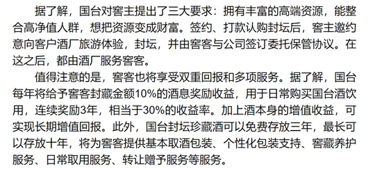 有意思的是,从之前的新闻通稿来看,国台的封坛珍藏酒在2010年开始销售,每年限量100吨,只招募百位窖主、千位窖客,主打的是稀缺性,有一定的增值价值。