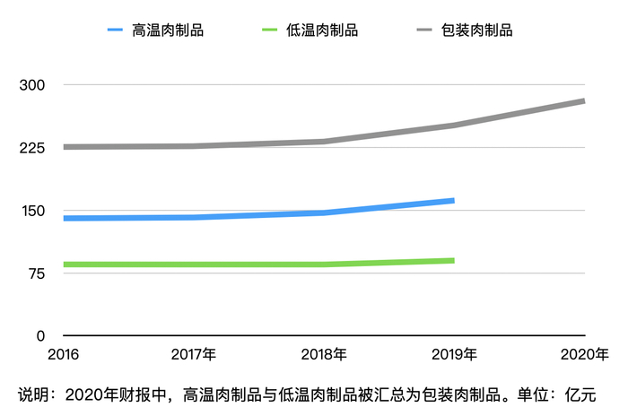 在2016-2019年间,双汇历年年报将肉制品按产品分为高温肉制品、低温肉制品、生鲜产品以及其他,到2020年,高温肉制品与低温肉制品合并为包装肉制品。从毛利角度看,以2019年数据为参考,高温、低温、生鲜依次在30%、26%、9%左右。从双汇肉制品增长趋势看,其中高温肉制品增幅高于低温肉制品。