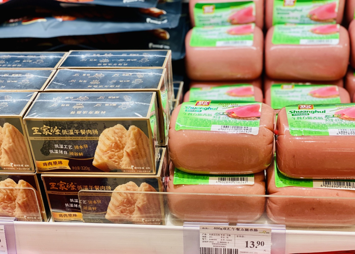 界面新闻走访超市注意到,双汇的竞争对手除了此前的金锣、荷尔美、等传统公司外,王家渡午餐肉、凤祥食品的优形鸡胸肉都正在成为双汇货架有影响力的对手。