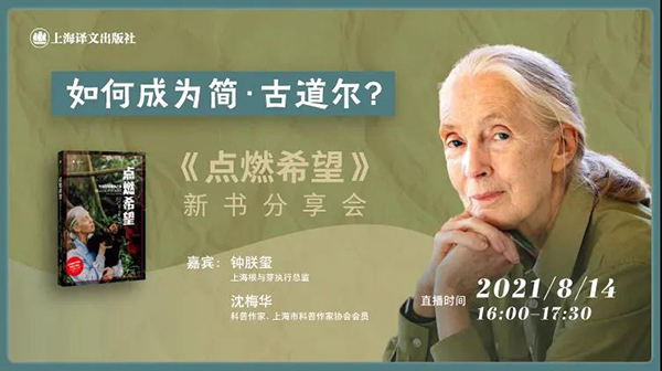 《点燃希望》是英国著名动物行为学家、环保人士简·古道尔(又译珍·古道尔)的回忆录。简·古道尔对科学的探索精神和为保护地球、保护人类未来付出的努力,鼓励了一代又一代年轻人为人类共同的环保事业而奋斗。她创办的“根与芽”在全世界范围享有声誉。8月14日,上海根与芽执行总监钟朕玺、科普作家沈梅华做客译文直播间,与《点燃希望》责任编辑薛倩一起回顾古道尔成长轨迹,分享她对人生的深刻体验,探讨作为榜样的简·古道尔能为我们带来哪些思考与启发。