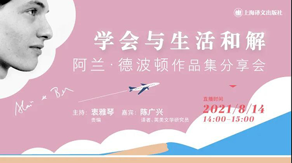 英伦才子、生活方式引领者阿兰·德波顿以一支生花妙笔,将看似艰深的哲学变得简单明了,并深入到生活之中。他以广博的学识和独特的视角,创作出了《哲学的慰藉》《旅行的艺术》《身份的焦虑》等14部作品,话题涵盖爱情、旅行、建筑、新闻、心理与宗教、文学等诸多领域。8月14日,阿兰·德波顿作品的译者陈广兴和责任编辑衷雅琴,在线解读德波顿的作品,分享他们在引进、翻译、阅读德波顿作品时的感受。