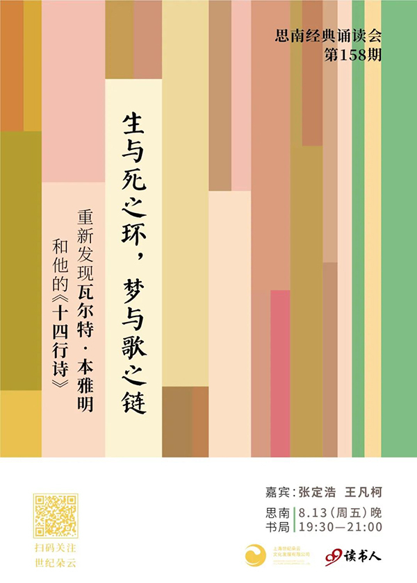 《十四行诗》是德国二十世纪的重要思想家瓦尔特·本雅明十分罕见的文学作品。全书共收录八十首诗歌作品,形式古雅,思想深邃。它是作家在青年时代思想转型的重要见证,也是少年情怀、心性与重大人生主题的奇妙结合,对世人理解、研究本雅明和德语诗歌都有着不容忽视的意义。8月13日晚,在思南书局,学者张定浩,《十四行诗》译者王凡柯,将一起从诗歌出发,深度解读本雅明神秘的思想转型历程。