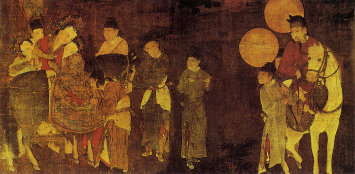 五代周文矩《太真上马图》(局部)。杨贵妃足踏一小凳,在众人扶持下,正欲上马,她成为全图的中心人物。