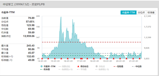 当前,中证军工指数(399967)当前估值分位在57%分位数水平,比较有性价比,距离泡沫有一定距离。