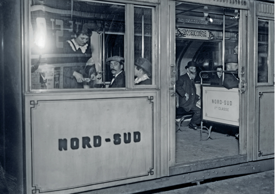狡猾而又身无分文的人很快就有了对付这种检票的办法。他们用面包屑填塞在旧票的小孔里,以便免费进行第二次旅行,从而愚弄了在昏暗中工作的打孔检票高手。其实,在当时,巴黎地铁的灯光并没有那么差。白色或乳白色的瓷砖将光线放大,让那些原本以为这里会像地下的其他东西一样,装饰得又黑又脏的人大吃一惊。地铁的车厢是木制的,比较土气。乘客只能从它们的单翼舱门慢慢地通过。开关门是由列车员控制的,在每个车厢的前部给列车员留了一个座位。