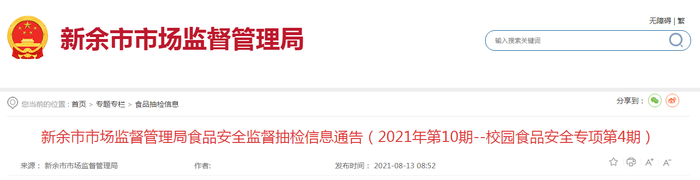 中国质量新闻网讯 8月13日,江西省新余市市场监督管理局网站发布食品安全监督抽检信息(2021年第10期--校园食品安全专项第4期)。本期公布抽检信息涉及校园食品安全(校园食堂及校园周边)10大类食品138批次样品,合格138批次。