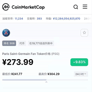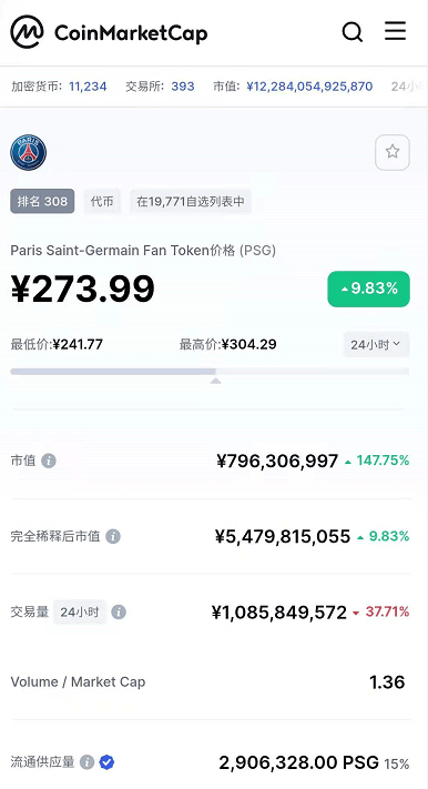 根据加密通货价格追踪网站CoinMarketCap的行情显示,“$PSG Fan Tokens”截至记者发稿时报273.99元,24小时最高价为304.29元,目前市值为7.96亿元。