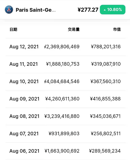 受到该消息的影响,巴黎圣日耳曼俱乐部的加密货币“$PSG Fan Tokens”这几天来成交额不断放大,最近一周的平均日交易量均在10亿元人民币(下同,除了特别标注外)以上,单价也由8月初的140元一度涨至371元,截至记者发稿时回落至273.99元,单日涨幅9.83%,单日成交超10亿元。