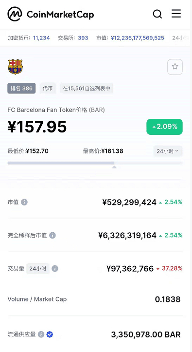 CoinMarketCap网站的最新行情显示,巴塞罗那代币价格为160元,尤文图斯代币为93元,曼城代币为153元,马德里竞技代币为133元。