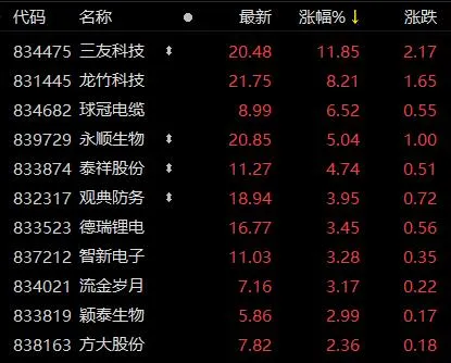 精选层今日位居涨幅榜的继续为首批精选层股票,三友科技大涨11.85%,股价创出历史新高;继昨日大涨近22%后,龙竹科技今日再度上涨逾8%,股价再度刷新记录,该股本周累计大涨逾46%;此外,球冠电缆、永顺生物、泰祥股份等个股本周持续攀高,永顺生物本周累计涨幅近38%。