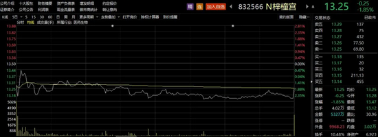 8月13日,梓橦宫正式挂牌精选层,该股开盘即跌破发行价,全天维持“破发”运行,盘终收报13.25元,较其发行价13.50元下跌了1.85%。该股全天换手率为10.48%。