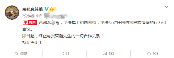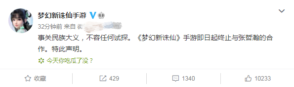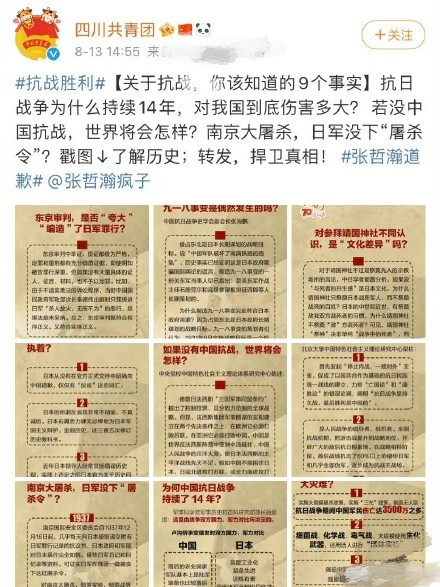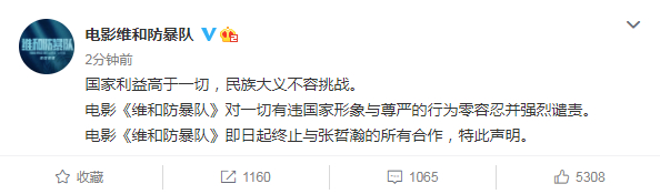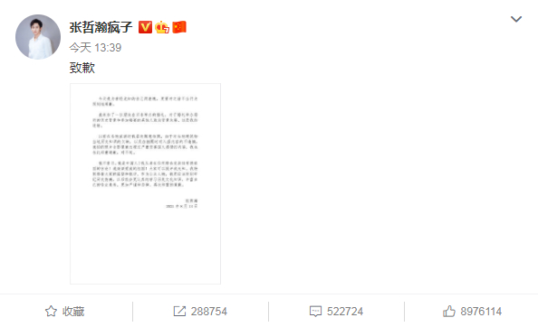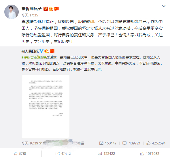 张哲瀚表示:“真诚接受批评指正,深刻反思,汲取教训。今后会以更高要求规范自己,作为中国人,坚决拥护祖国,爱党爱国的坚定立场从未有过丝毫动摇,今后会用更多实际行动热爱祖国,履行自身的责任和义务,严于律己!也请大家以我为戒,关注历史,学习历史,牢记历史!”。