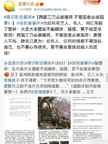 其中,央视新闻怒批张哲瀚:张哲瀚触碰了历史伤痕,伤害了民族感情,不能简单归咎为“曾经无知”,否定了张哲瀚的道歉,在大是大非面前,道歉并没有用,尤其是以各种理由为自己推脱。