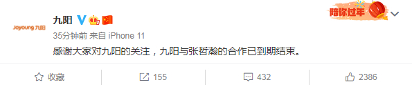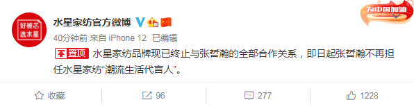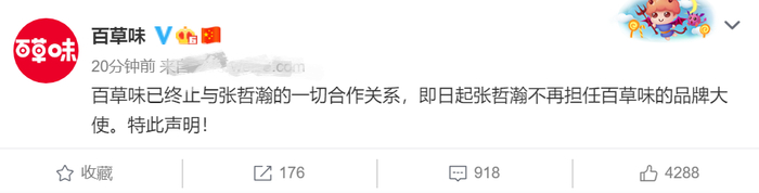 娃哈哈、水星家纺、京都念慈?、徐福记、且初、安克、梦幻新诛仙手游、九阳、潘多拉珠宝、电影《维和防暴队》、百草味先后在官微发文宣布和张哲瀚解约。