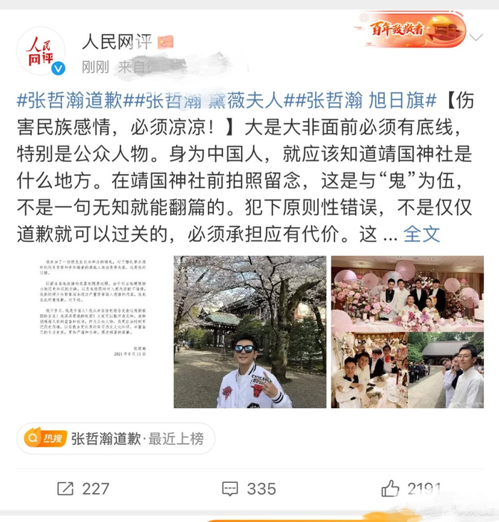 8月13日,艺人张哲瀚先后被曝出在乃木神社参加友人婚礼,在靖国神社内拍照留念,张哲瀚的错误行为不仅触碰到了历史伤痕,更伤害了民族感情,虽然张哲瀚在事后发声道歉,用“曾经无知”为自己开脱,网友们却并不买账,商务方面同样受到影响,品牌方陆续官宣和他解约,商业价值归零,演艺生涯彻底凉凉。
