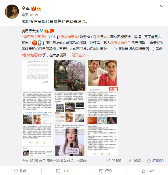 此前,因为高考舞弊遭到抵制的仝卓也转发官媒的表态,怒批张哲瀚:“我们没有资格代替牺牲的先辈去原谅”。