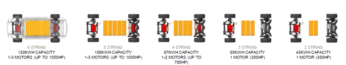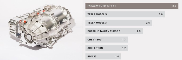 法拉第的电机有着相对于同级别更轻量化的设计,以及较高的效率,所以整体功率重量比优于同级别。根据官网披露,FF的逆变器结构紧凑且重量轻,直接安装到功率高达350HP(261千瓦)的大功率电机上,可提供850 Amps rms交流电流,其体积为8升,重量为8kg。FF的单个驱动单元包含电机、变速箱和驻车系统,重93kg,功率重量比为2.8 kw/kg。双驱动装置重145kg,可提供高达700HP(522千瓦)的功率,功率重量比达3.6 kw/kg。三个电机加起来可以达到1050Hp。