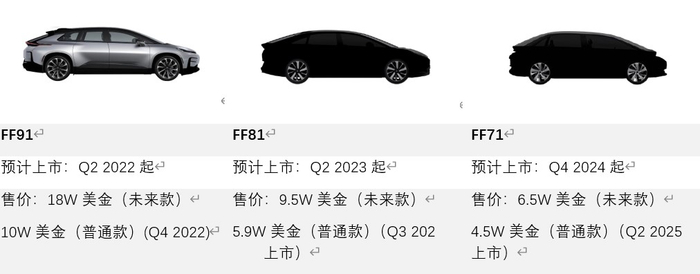 图 16: FF的三个车型FF91(左), FF81(中), FF71(右边)的预期上市时间和售价
