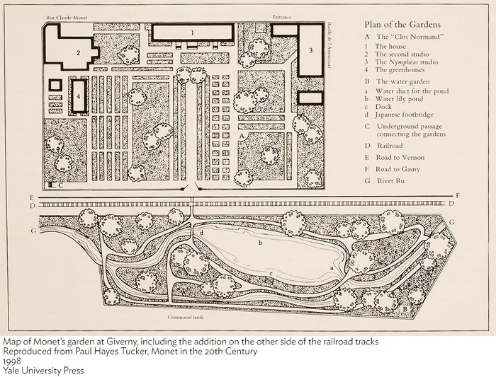 莫奈吉维尼花园的地图,画面包括附近的铁轨