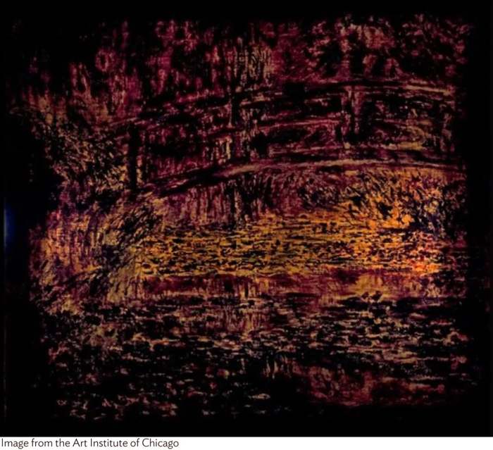 透射光成像显示出《睡莲池》中的笔刷痕迹