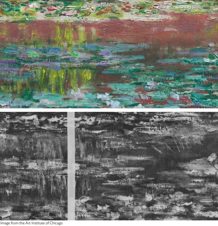 《睡莲池》的自然光和X光成像对比显示了构图上的变化