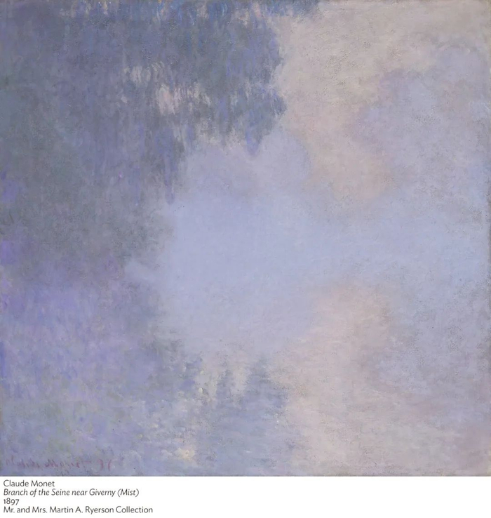 如果我们仔细对比《睡莲池》和芝加哥艺术博物馆收藏的另一幅莫奈作品——《吉维尼附近塞纳支河(薄雾)》,就会发现两幅画既相似又差异:它们明显地体现了莫奈热衷的主题——水、水中的倒影、水与陆地或天空相接的,复杂变幻的瞬间。纵观莫奈的绘画生涯,这一主题一直萦绕在他的脑海,进入20世纪以后,这是他主要描绘的内容。