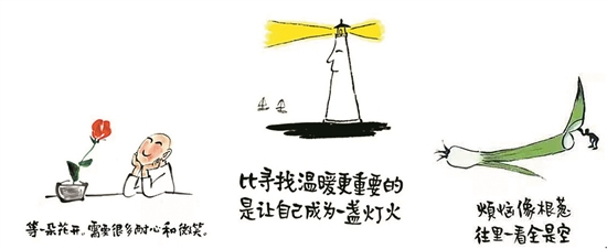 亲爱的同学,步入大学,我们也悄然成年。竞争会有压力,实验项目会有失败,种种烦恼会悄无声息地袭来,我希望你能用耐心与乐观武装自己,去勇渡险滩,勇攀高峰,去欣赏日出日落、云卷云舒。相信我,你滋育着的人生之花,有一天终将绽放。正如这幅漫画:“烦恼像根葱,往里一看全是空。”希望你能耐心、乐观地面对困难,渡过难关,静待花开。