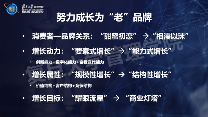 “新”品牌努力成长为“老”品牌,要解决三方面问题:第一,要将品牌与消费者的关系,从短暂且富有激情的“甜蜜初恋”转化为长期稳定“相濡以沫”的牢固品牌关系;第二,要把握新品牌成长的动力,进一步提升自身创新能力、数字化能力和营销策略的自我迭代能力,实现“要素式增长”向“能力式增长”的转变;第三,要将增长属性从“规模式增长”向“结构式增长”驱动转化,通过不断优化自身给顾客提供的价值结构来实现可持续增长。