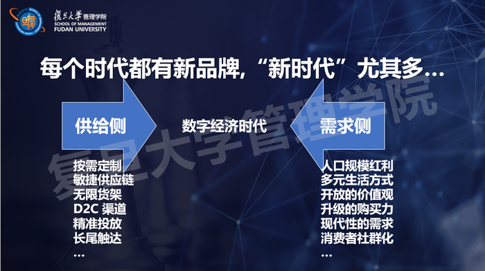 从供给侧的角度来看,数字经济时代为商品提供了无限货架,任何品牌都能用更低成本拥有自己的货架,而不需要像传统工业经济时代必须通过渠道资源才能覆盖到消费者。例如,依托数字化电商平台,品牌商可以让自己的产品精准触达到客户。供给侧的变化为新品牌提供了很好的机会,不需要有非常强大的渠道和媒体资源,也可以触达非常小众且精准的长尾人群。