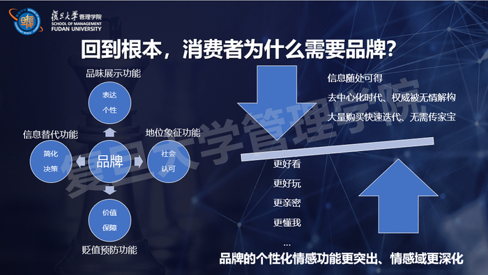 根据北大彭泗清教授的总结,在数字经济时代,品牌的这四大功能发生了变化:第一,信息随处可得,品牌信息替代功能消失了;第二,在去中心化时代,权威被无情解构,品牌的地位象征功能下降;第三,在物品大量购买、快速迭代的当下,我们也都不再需要“传家宝”,因此品牌的价值保障功能也下降了。第四,品牌的情感功能却变得更为突出,能够帮助消费者表达个性,给消费者情感关怀。现在,消费者更注重品牌是否好玩、好看、有趣、懂我,以及是否与我更亲密。品牌对消费者价值机制发生根本性的变化是导致品牌发展模式变化的根本原因。