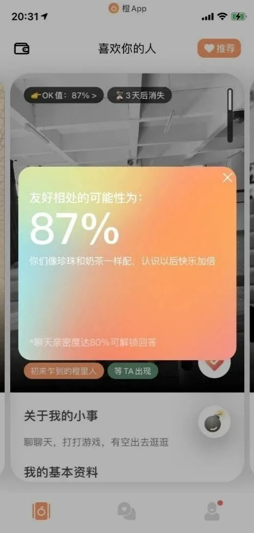还有的 APP 尝试用全新的玩法赋予交友以更深的意义。像‘恋爱圈’和‘橙 App’都强调‘女生把握主动权’,在恋爱圈只有女生可以发起对话。据 IT 桔子了解,橙 App 由即刻团队在去年 3 月推出,橙谐音‘成双成对’的‘成’,用户通过手机号成功注册后即可体验游戏化的恋爱社交玩法:点开推荐的异性列表(每天限量 20 位),女生有评价打分权利,负分男生会被‘送走’;还有简单趣味的‘三观’测试题,系统据此会显示出双方的匹配度(OK 值)。